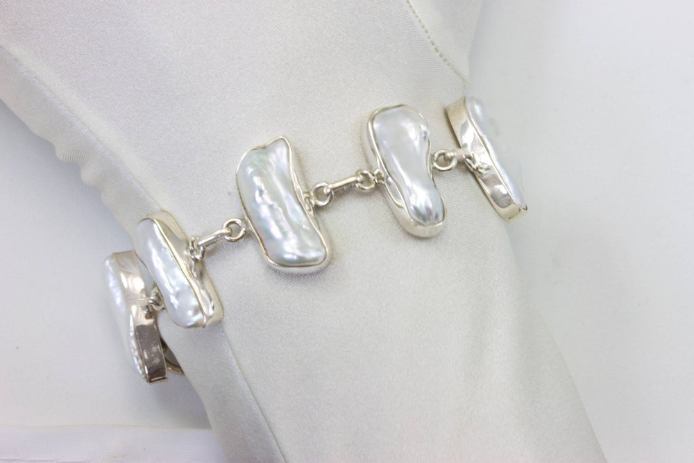 Sterling Silver Freshwater Cultured Pearl Bracelet Baroque White Adjustable Toggle Clasp 6 7 Inches Inch Bezel Set Nice Luster Elongated