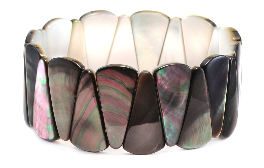Mother of Pearl Shell Bracelet Natural Rainbow Black Iridescent Colors Black Lip Oyster Stretchy Spyglass Designs 6.5 7 Inch Adjustable