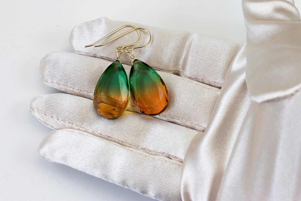 Bicolor Quartz Earrings Faceted Pear Briolette Bi Colored Yellow Amber 14k Solid Gold or Filled or Sterling Silver Long Teardrop Fancy Drops