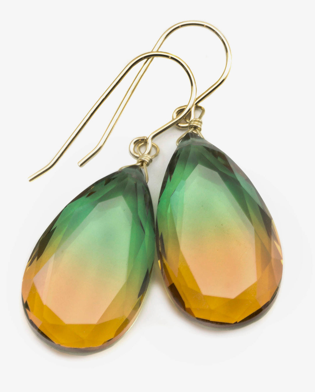 Watermelon Bicolor Simulated Tourmaline Earrings Facet Large Bi Color Teardrop Green Honey Yellow Amber Sterling Silver 14k Gold or Filled