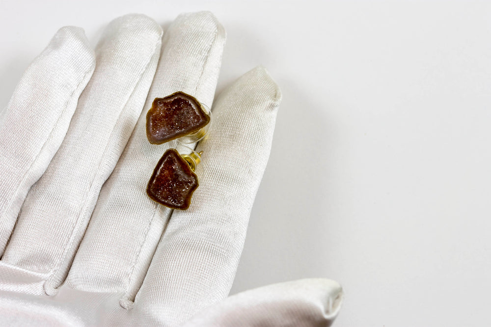 Baby Geode Earrings Tabasco Black Amber Cream Druzy Post Studs 14k Gold Filled Small Natural Drusy Quartz Halved Geodes Paired AAA