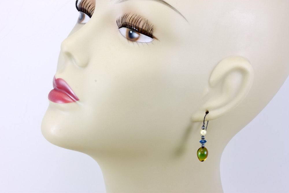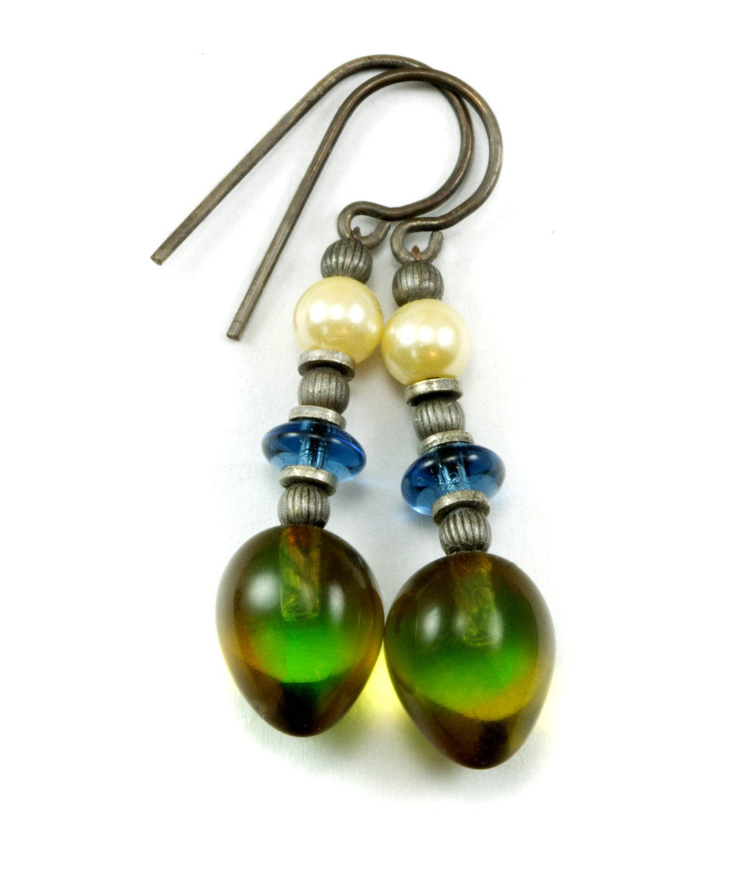 Vintage Czech Glass Earrings Green Amber Briolette Black Oxidized Sterling Silver Long Drops Art Deco Style Unique Color Beads