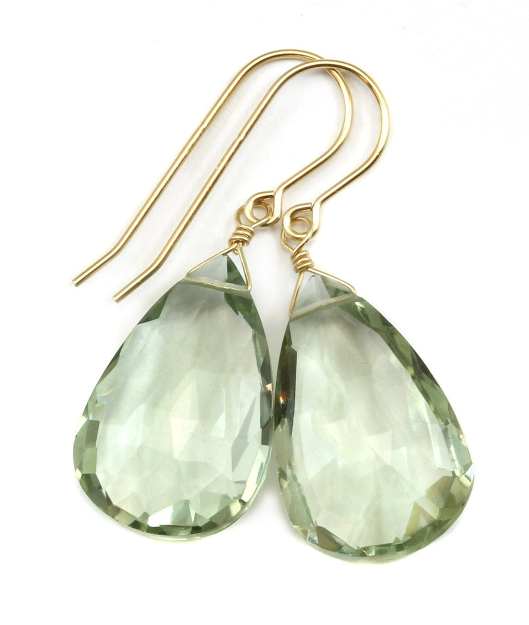 Green Amethyst Earrings Prasiolite Faceted AAA Pear Teardrop 14k Solid Gold or Filled or Sterling Silver Large Fat Drop Classic Briolettes