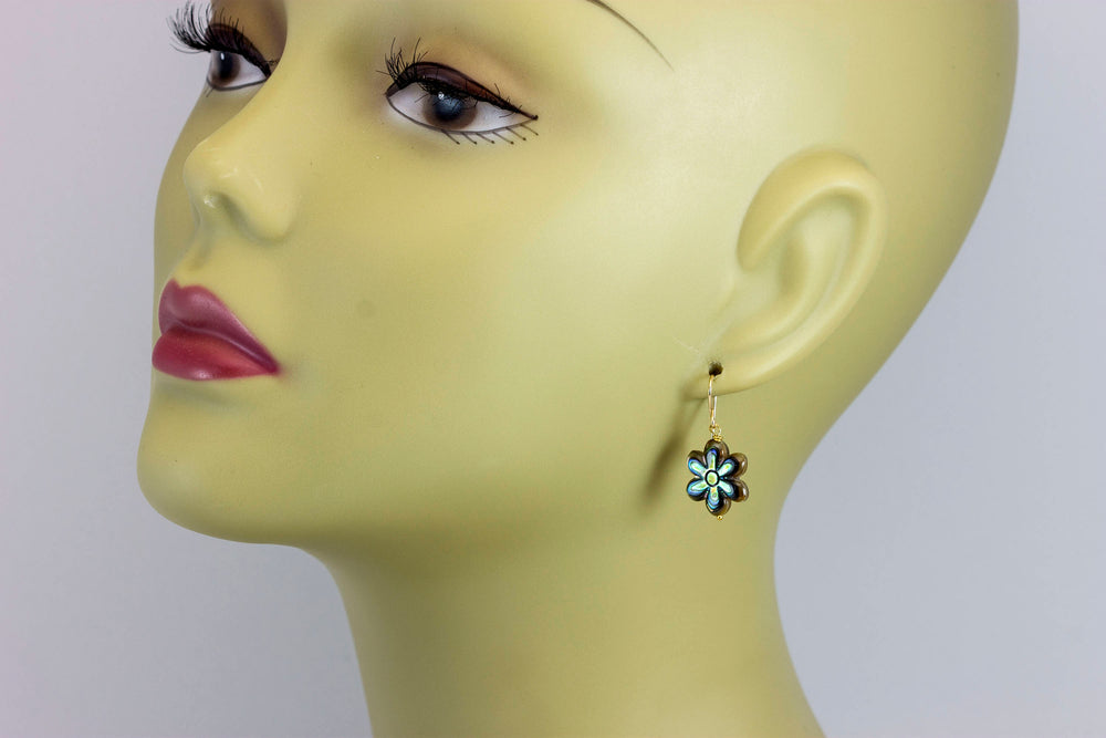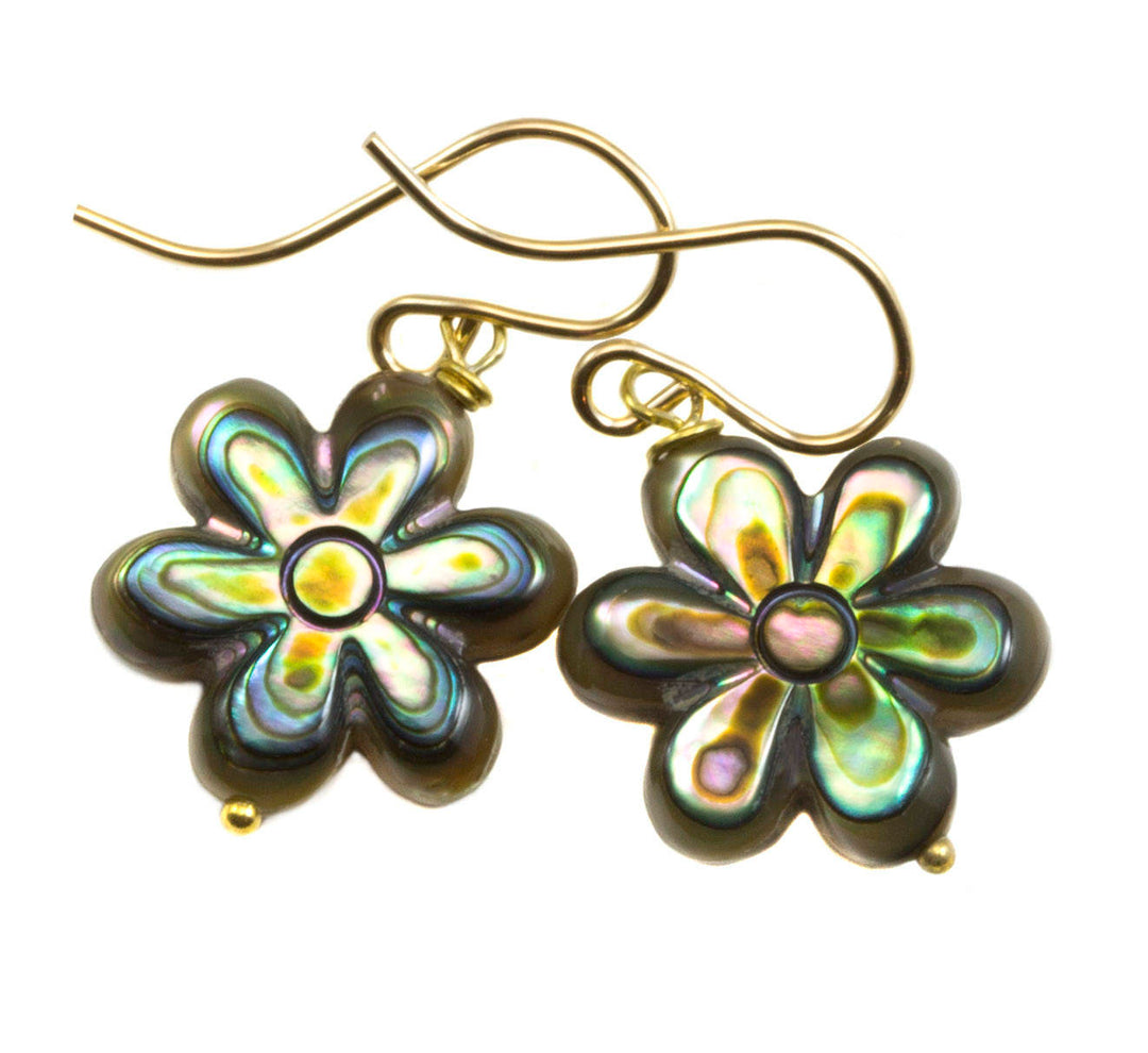 Abalone Paua Shell Flower Earrings Natural Peacock 14k Solid Gold or Filled or Sterling Silver Carved Flowers MOP Drops Multiple Colors