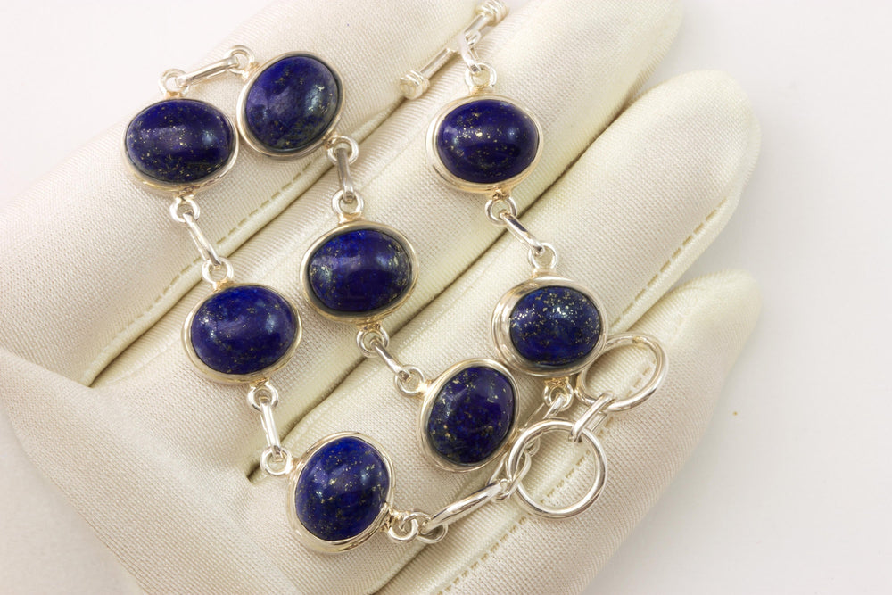 Blue Lapis Lazuli Bracelet Bezel Set Sterling Silver Toggle Clasp Smooth Cabachon 7 8 Inches Adjustable Earthy Natural Rich Blue Lapis
