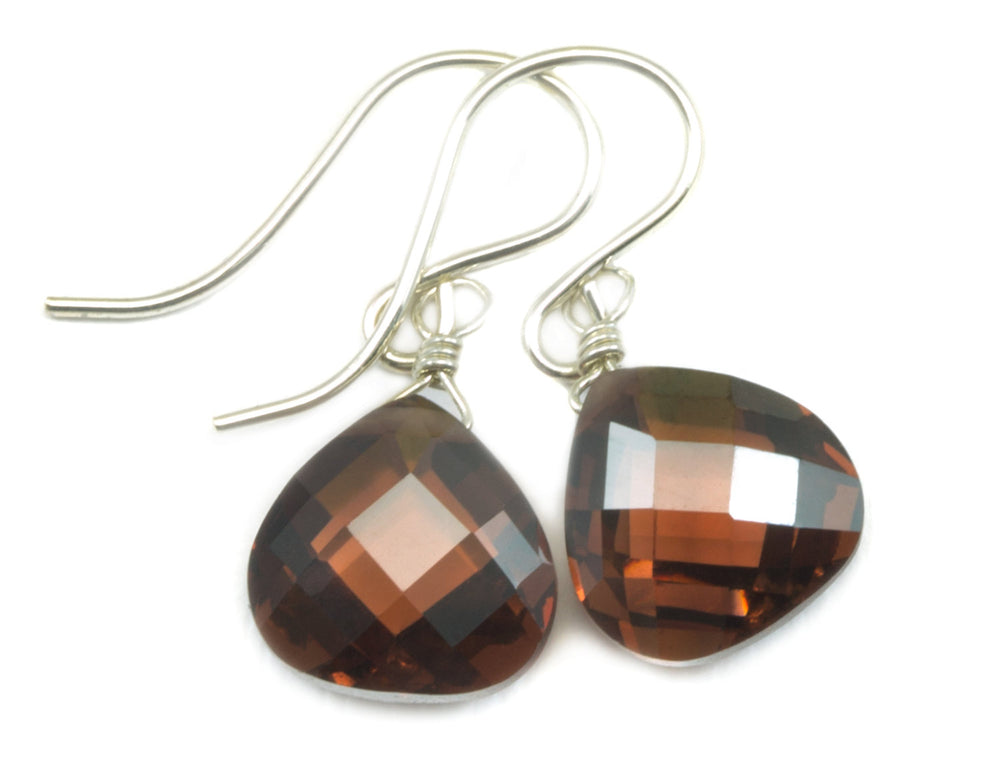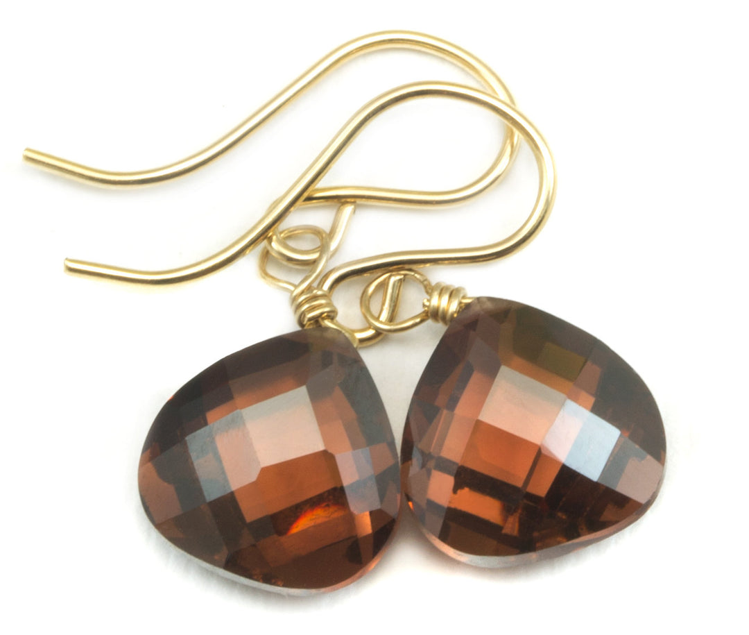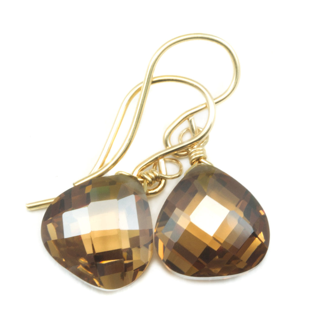 Dark Chocolate Cubic Zirconia Earrings Heart Briolettes AAA CZ 14k Solid Yellow Gold or Filled or Sterling Silver Simulated Diamond Simple