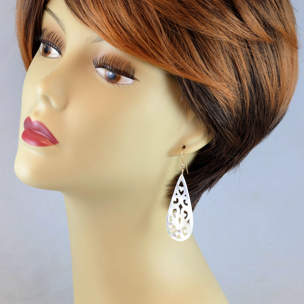 Mother of Pearl Earrings White Shell Carved Relief Teardrop Natural 14k Solid Gold or Filled or Sterling Silver Large Long Luster MOP 2 In