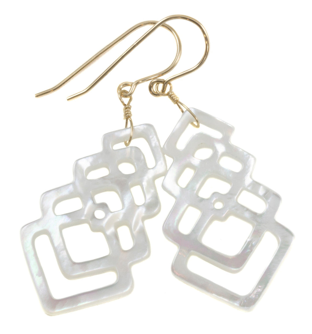 Mother of Pearl Earrings White Shell Carved Tiered Square Teardrop Natural 14k Gold or Filled or Sterling Silver Large MOP Drops 2 Inch