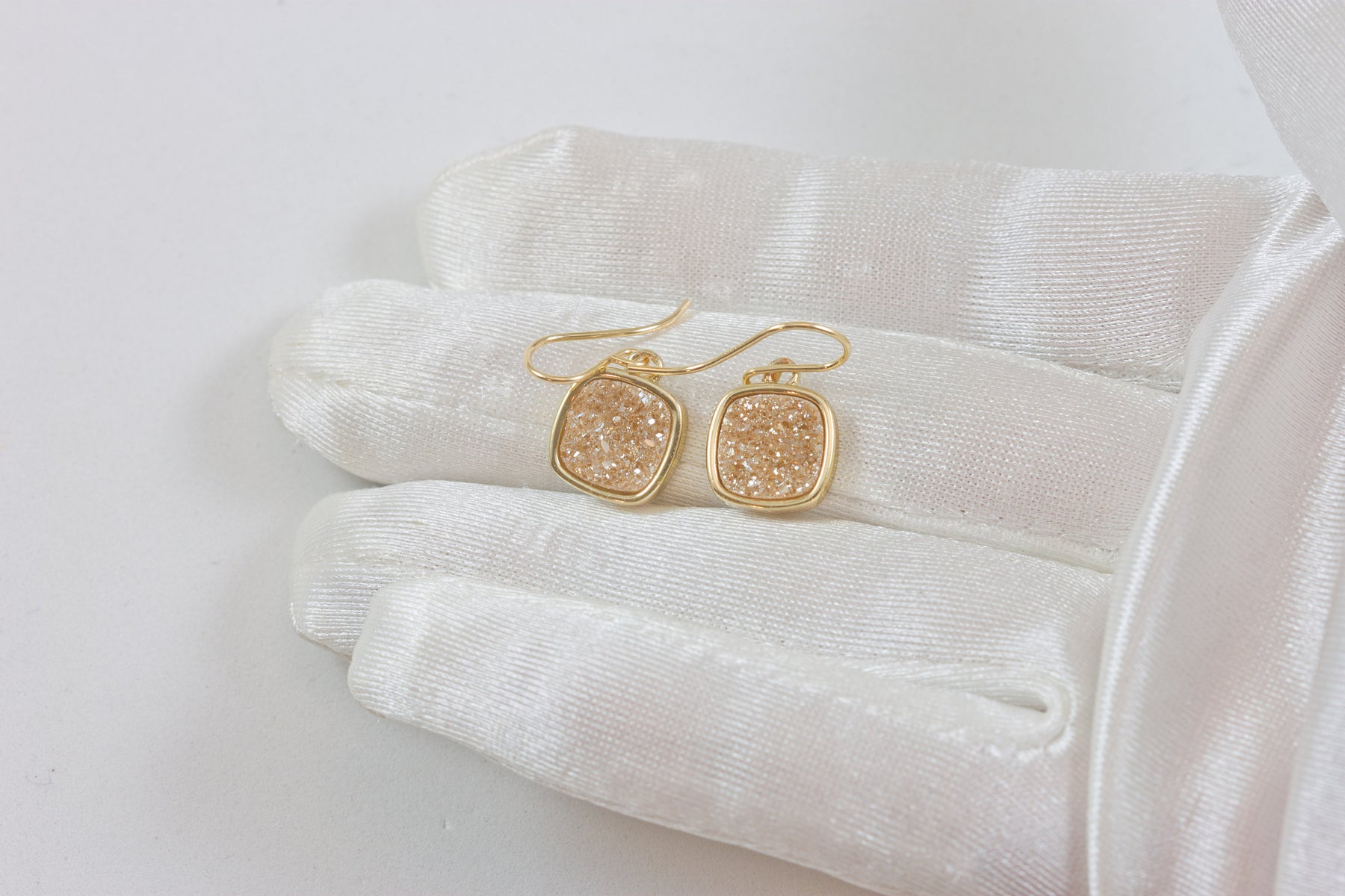 Pink Drusy Earrings Druzy Square Shaped Sterling Silver or 14k yellow solid gold or filled Bezel Simple Drops Fine Druse Quartz Spyglass