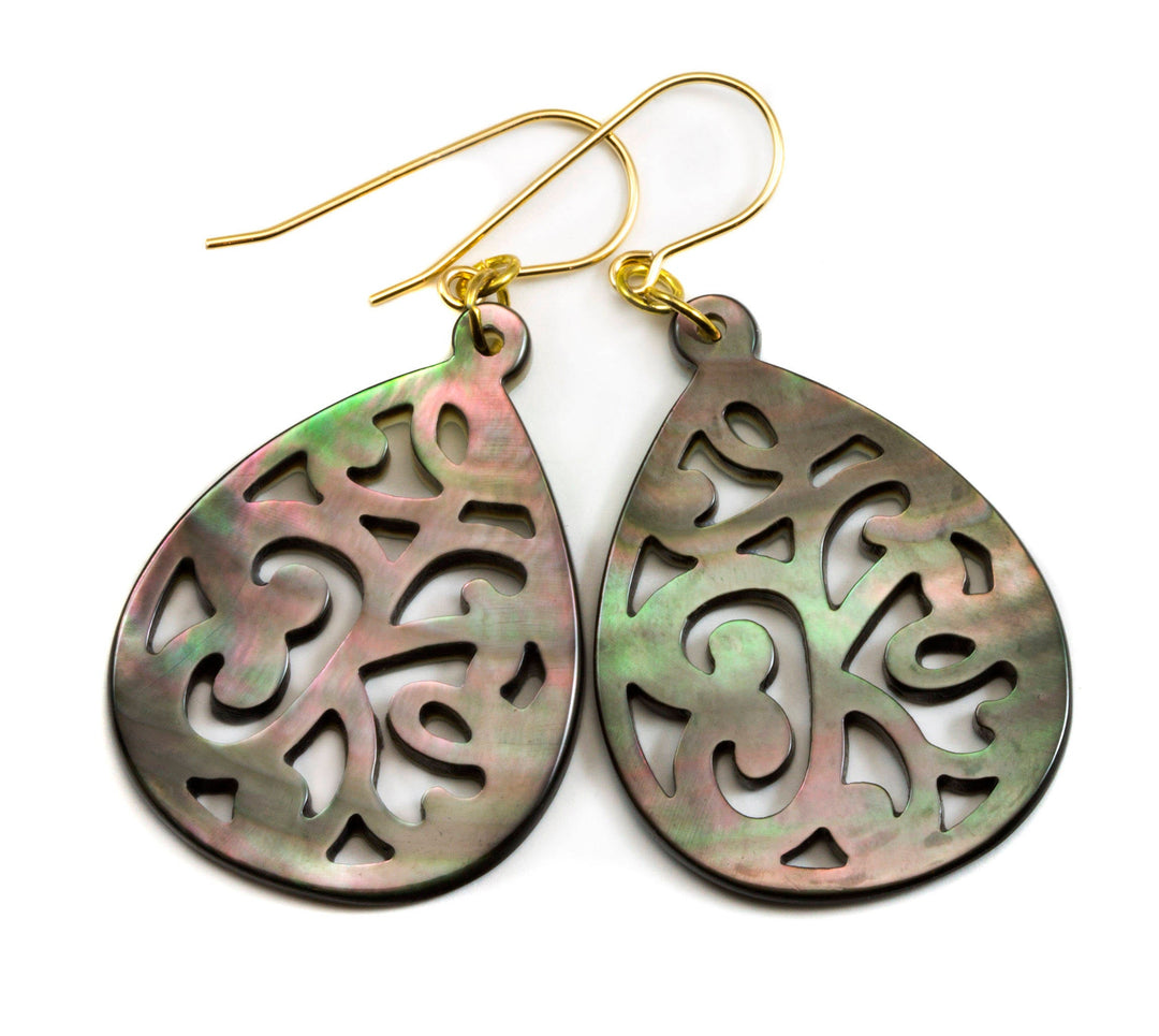 Mother of Pearl Earrings Peacock Black Shell Carved Relief Teardrop Natural 14k Solid Gold or Filled or Sterling Silver Large Luster MOP 2