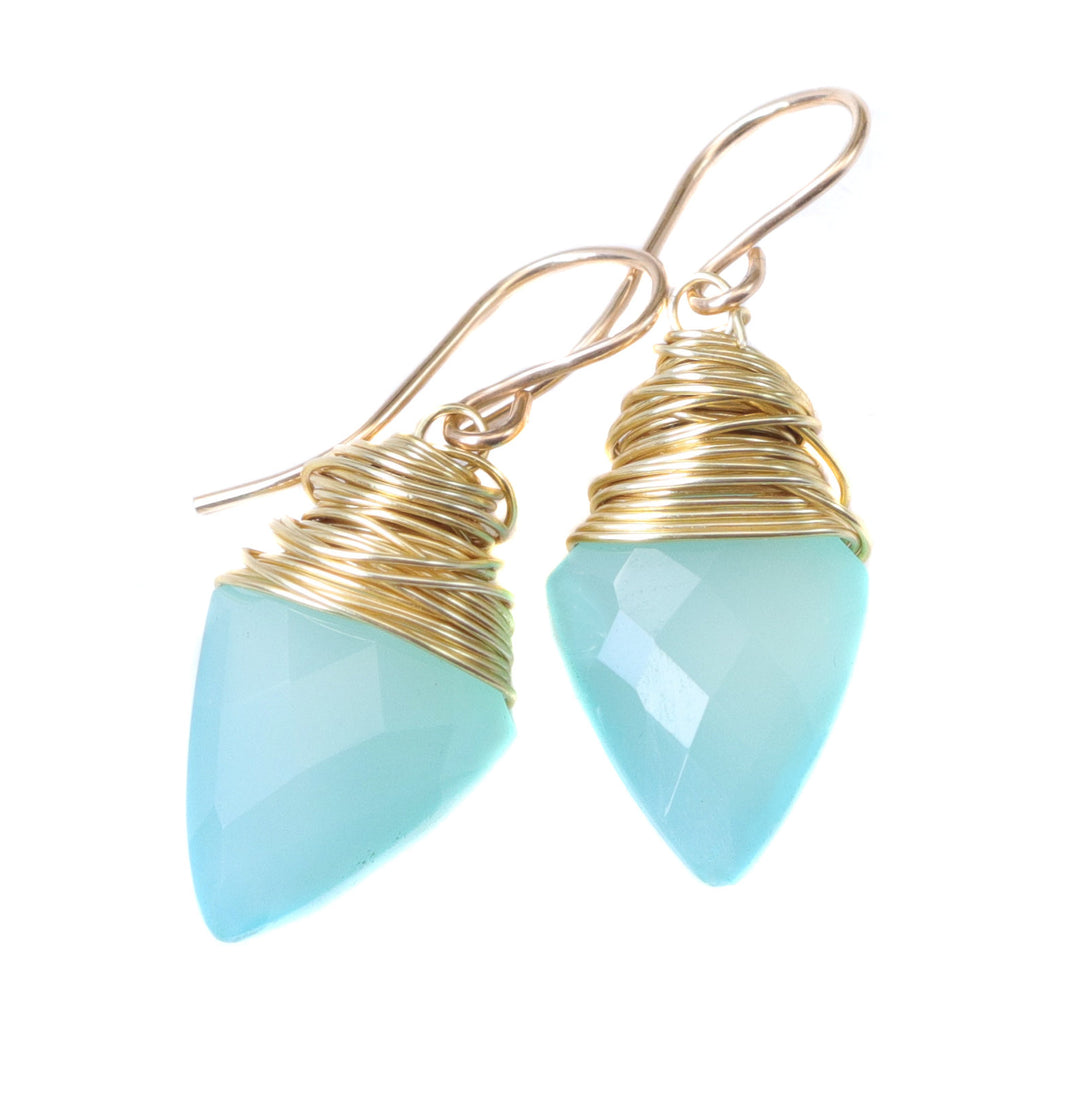 Aqua Blue Chalcedony Earrings 14k Solid Gold or Yellow or Rose Filled or Sterling Silver Teardrop Pointed Faceted Wire Wrapped Dangles
