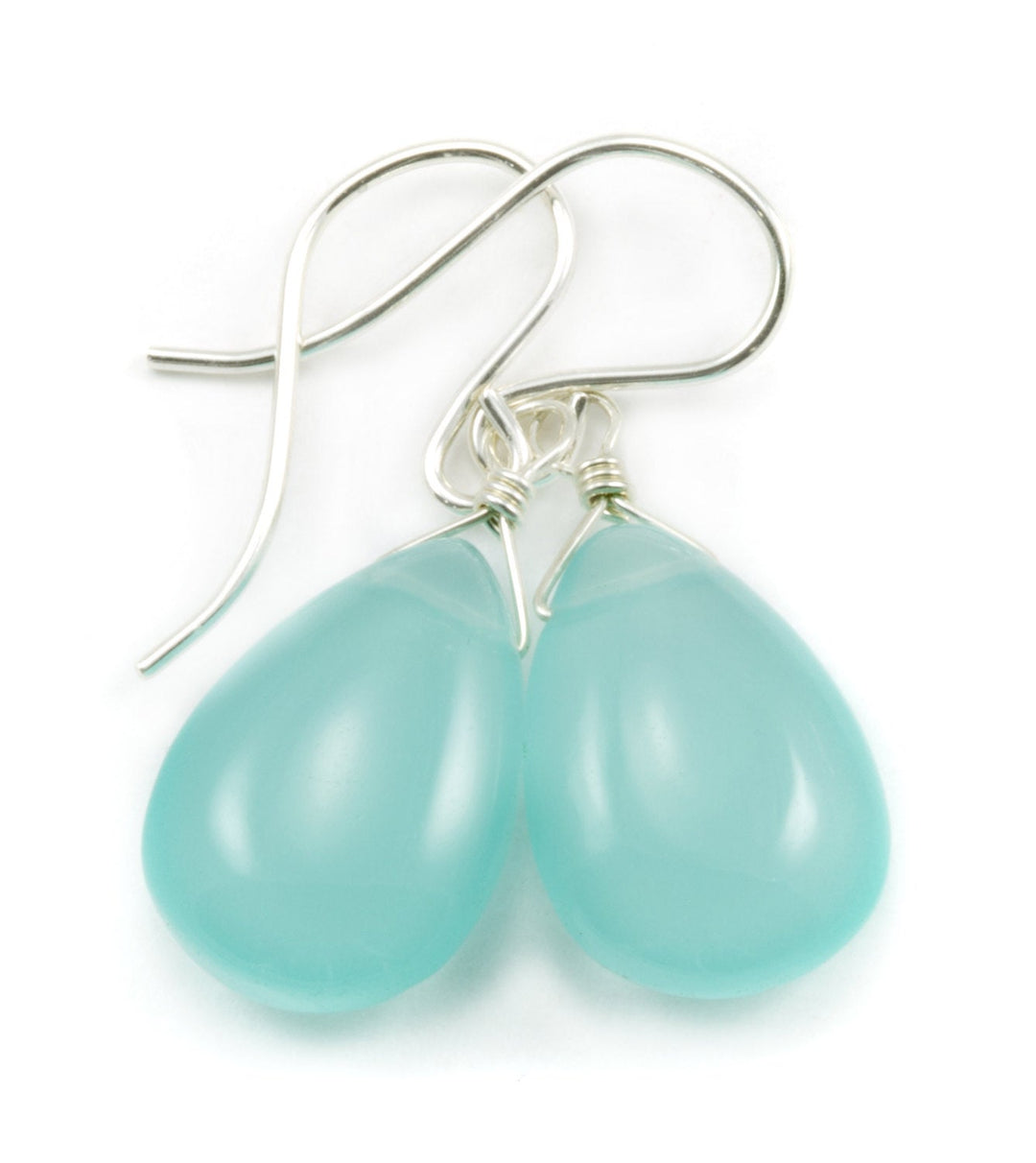 Aqua Blue Chalcedony Earrings Sterling Silver or 14k Solid Gold or Filled Teardrop Pear Smooth Cut Simple Natural Soft Blue Classic Daily