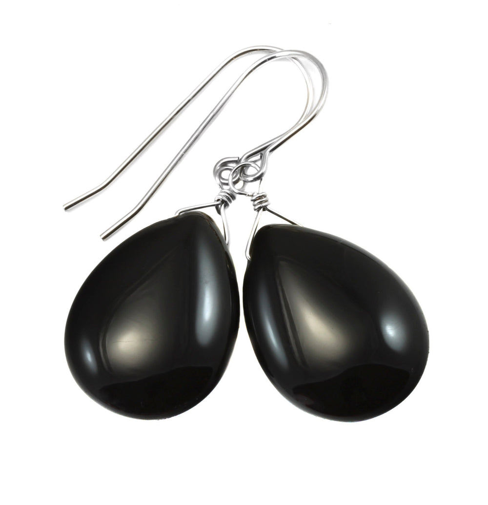 Black Onyx Earrings Smooth Large Teardrop Dangle Sterling Silver or 14k Solid Gold or Filled Rounded Long Drops Simple Classic Black Agate