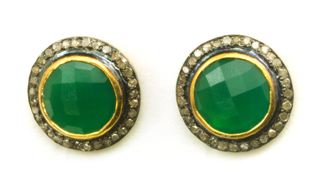 Green Onyx Earrings Natural Pave Champagne Diamonds 14k Yellow Gold over Sterling Silver black Rhodium Plate Round Post Stud Style