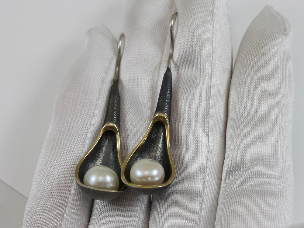 Pearl Earrings 14k solid gold and Oxidized Black Sterling Silver Freshwater Cultured Pearls Bowl Artisan Handmade Design Earthy Fluid Drops