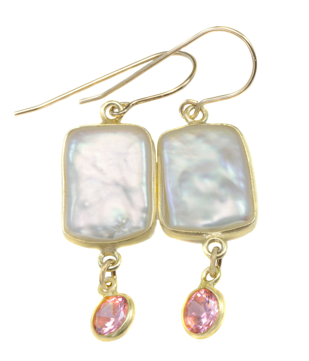 Pearl Earrings 14k solid yellow gold or filled Rectangular Bezel Blue Pink Sapphire CZ Double Hung Freshwater Pearls Rectangle 1.7 Inch