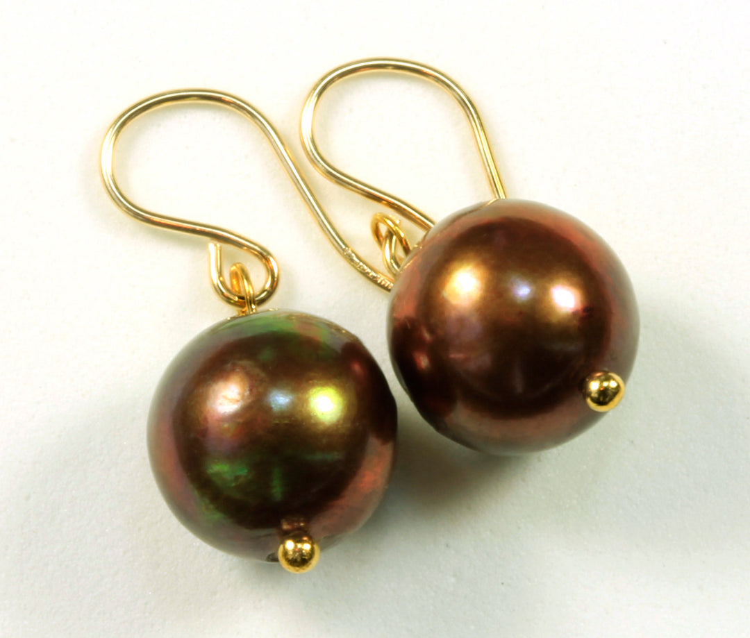 Chocolate Pearl Earrings Freshwater Cultured Pearls Round Drops 14k solid yellow gold or filled or Sterling silver Dangles Simple Pearl