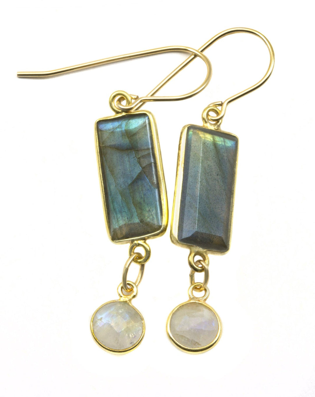 Labradorite and Rainbow Blue Moonstone Earrings 14k Gold Filled Rectangle Teardrop Natural Blue Flash Simple Shimmery Drops Bezel Set
