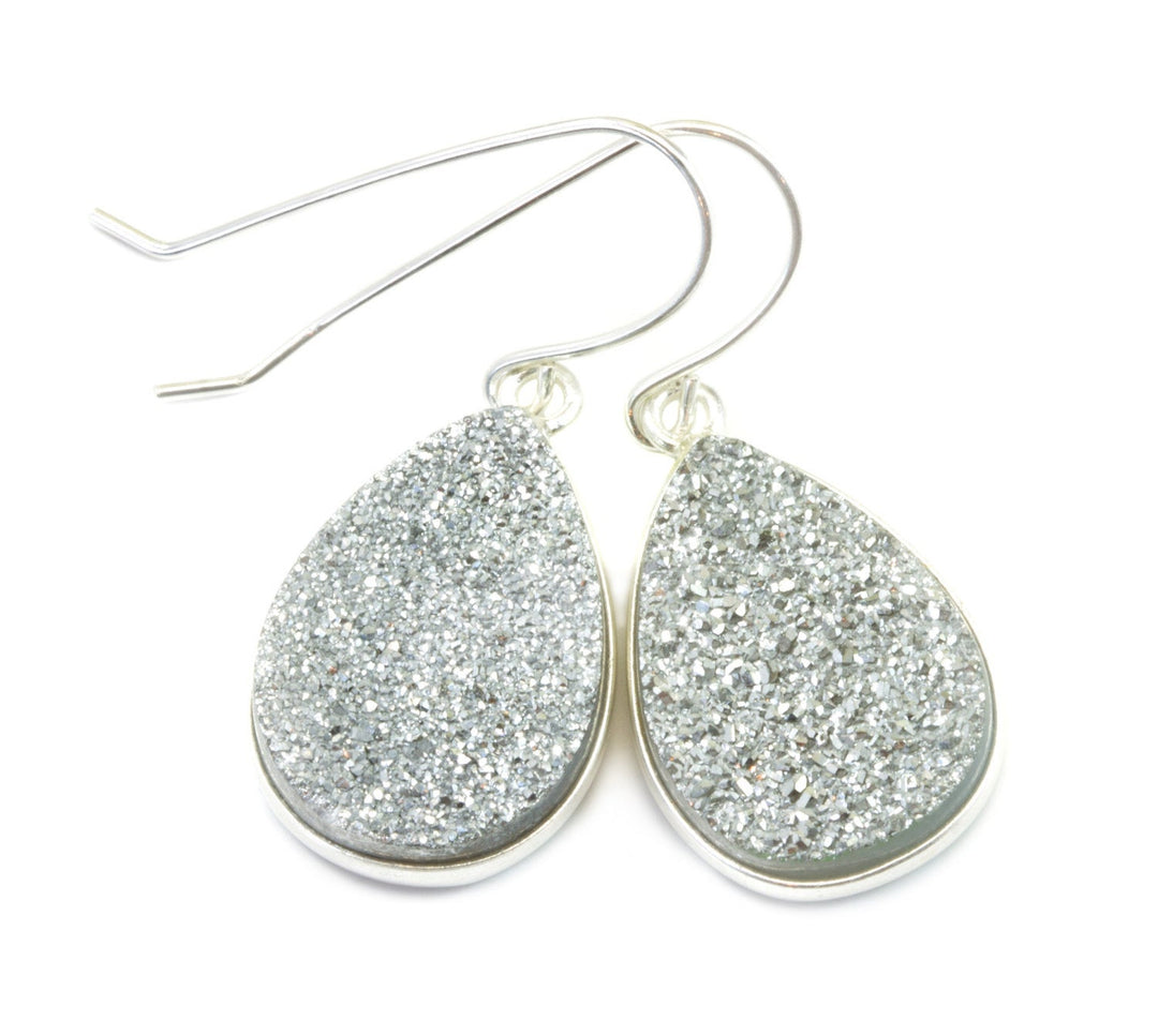 Silvery Drusy Earrings Druzy Teardrop Shape Sterling Silver French Ear Wires Bezel Set Simple Drops sparkley shiney large ovals
