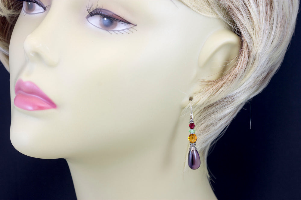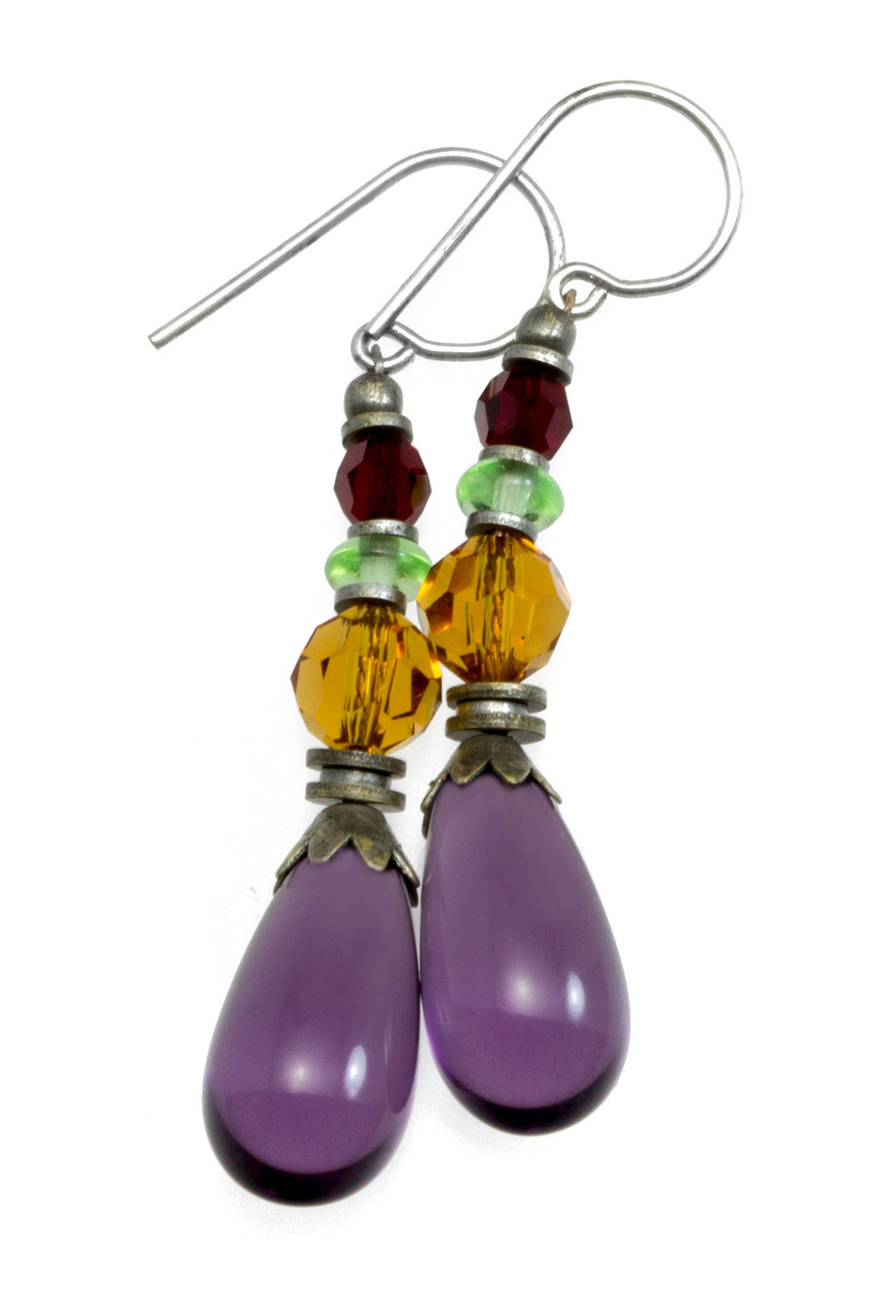 Vintage Czech Glass Purple Briolette Earrings Black Oxidized Sterling Silver Long Drops Art Deco Style Colorful Beaded Simple Teardrops