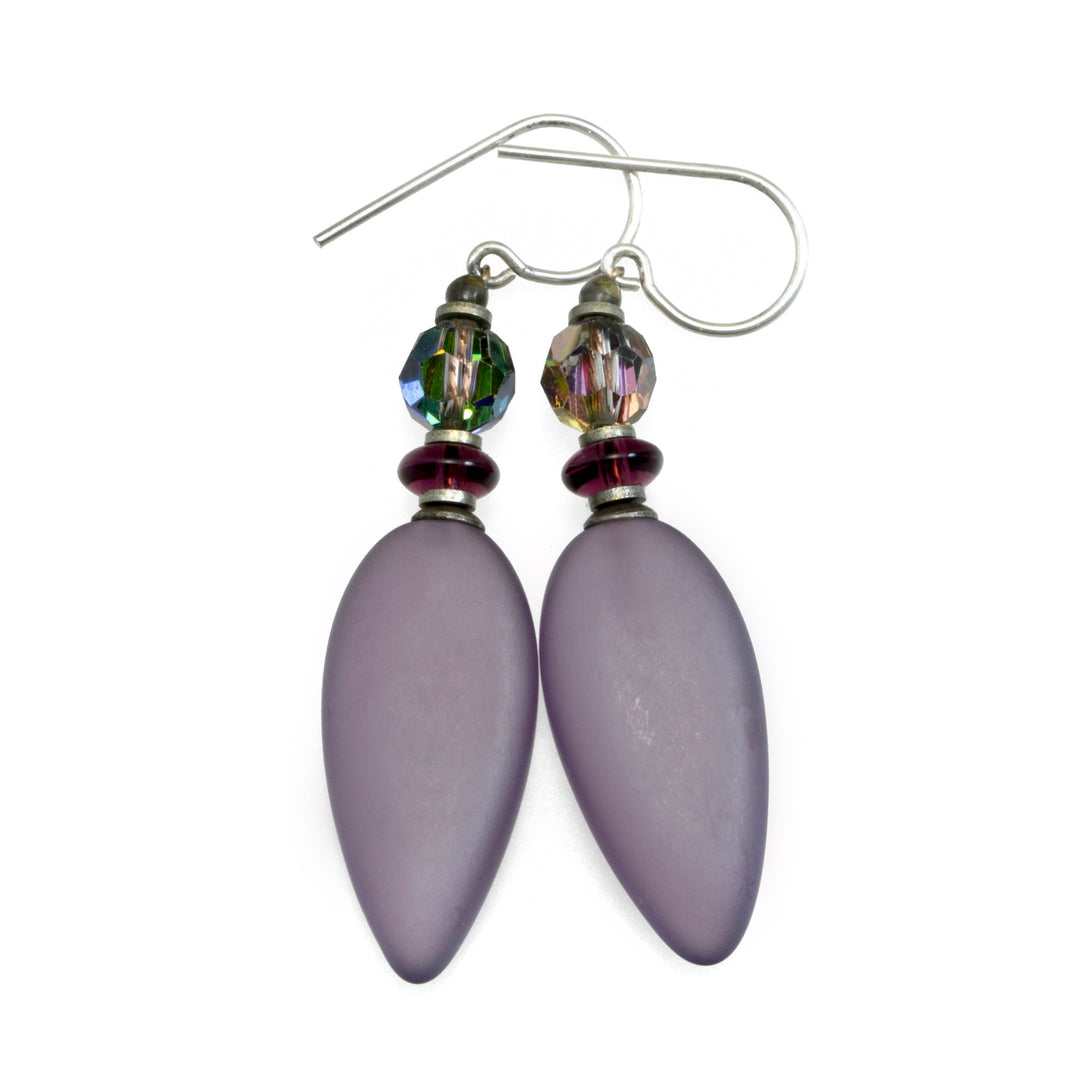Vintage Czech Glass Purple Frosted Matte Briolette Earrings Black Oxidized Sterling Silver Long Drops Art Deco Colorful Simple Teardrops
