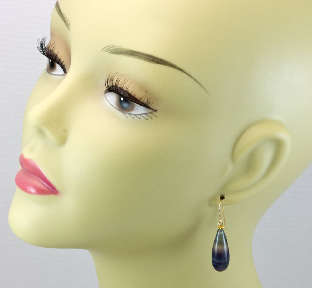 Fluorite Earrings Smooth Teardrop 14k solid gold or filled or sterling silver Natural Flourite Fat Round Drop Striped Teal Purple Beaded