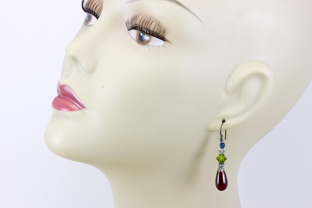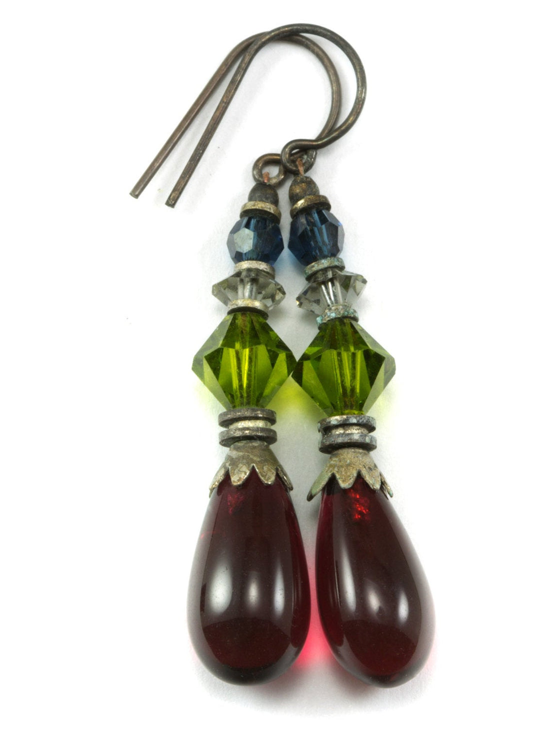 Vintage Czech Glass Red Briolette Earrings Black Oxidized Sterling Silver Long Drops Art Deco Style Colorful Beaded Simple Teardrops