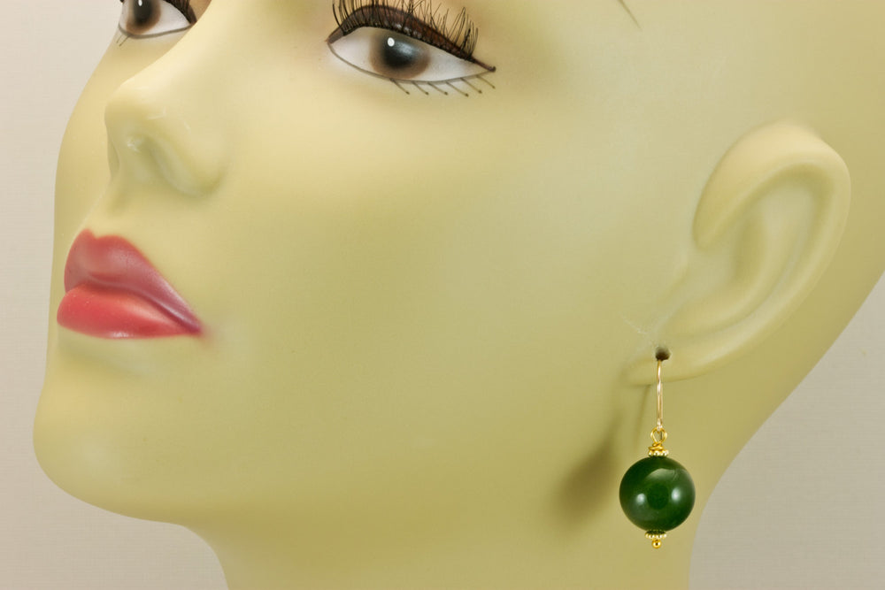 Serpentine Earrings Green Jade Color Round Cut Bead Accents 14k Solid Gold or Filled or Sterling Silver Smooth Spyglass Designs Simple Drops