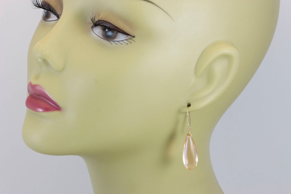 Peach Morganite Earrings Smooth Long Simulated Pink Morganite Teardrop Drop Dangle Sterling Silver or 14k Gold Filled Classic 1.6 Inches