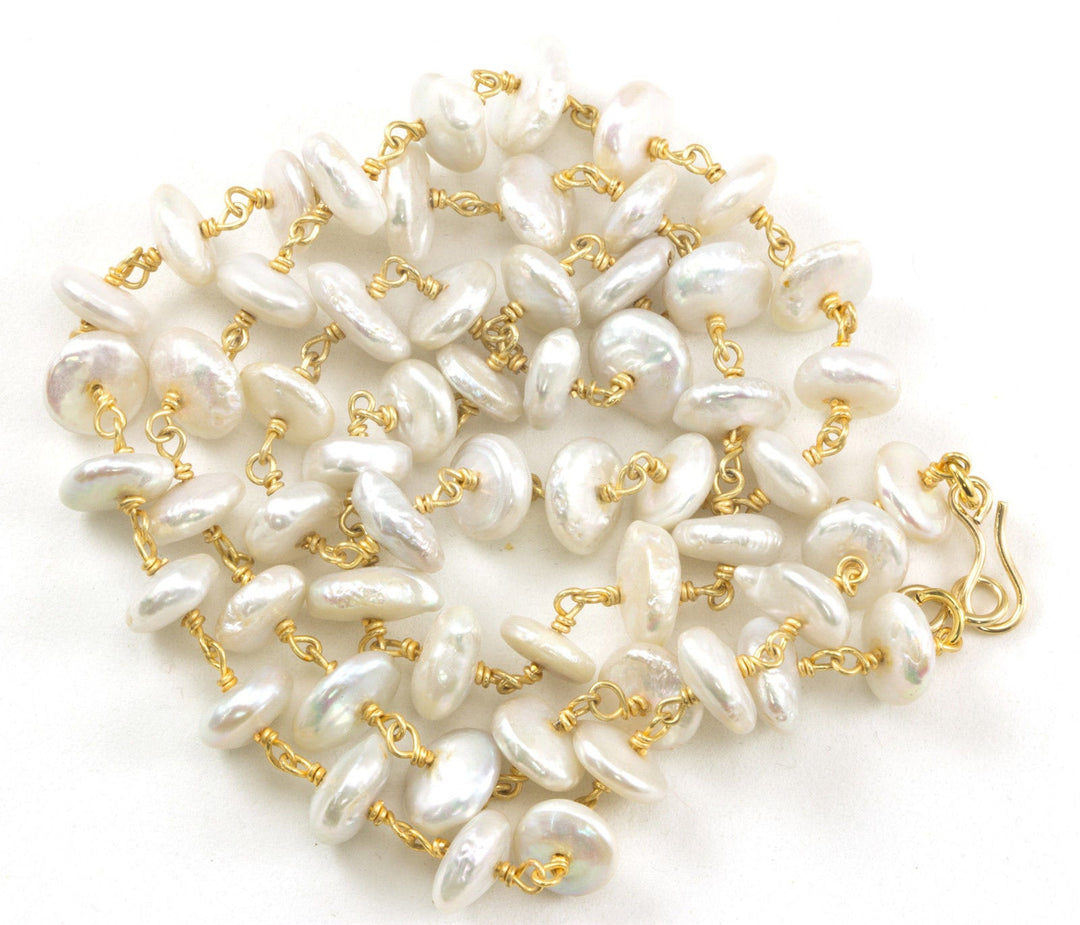 White Button Pearl Necklace Natural Freshwater Cultured Pearls 14k Gold filled Clasp and Plate Chain Link 24 Inches Center Drilled Unique