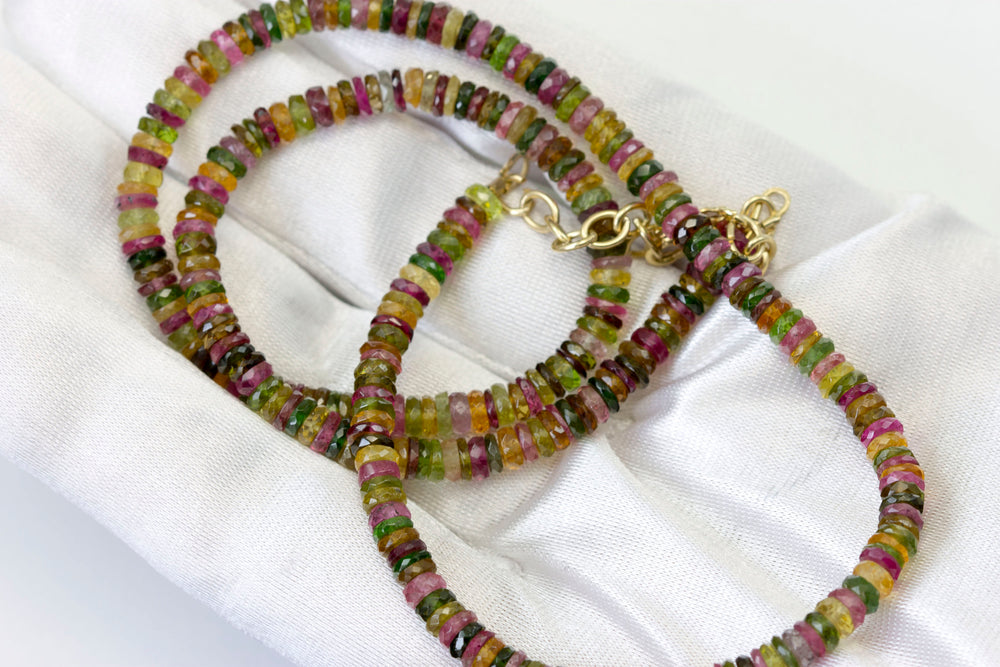 Multi ColorTourmaline Necklace Natural Earthy Rondelle Solid Strand Pink Green Sterling Silver 14k Gold Filled Micro Facet 20 Inches Simple