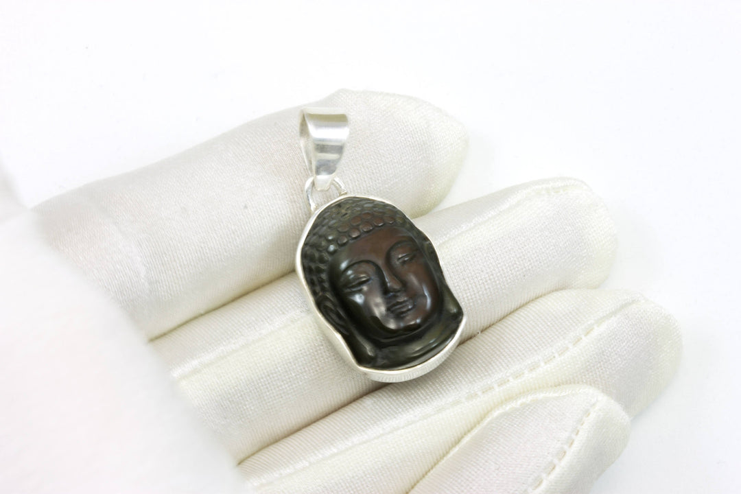 Buddha Necklace Pendant Black Carved Obsidian Sterling or Gold Plate Bail large Carved Head Obsidian Black Stone Bezel Set Men's Man Women