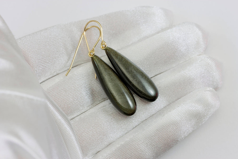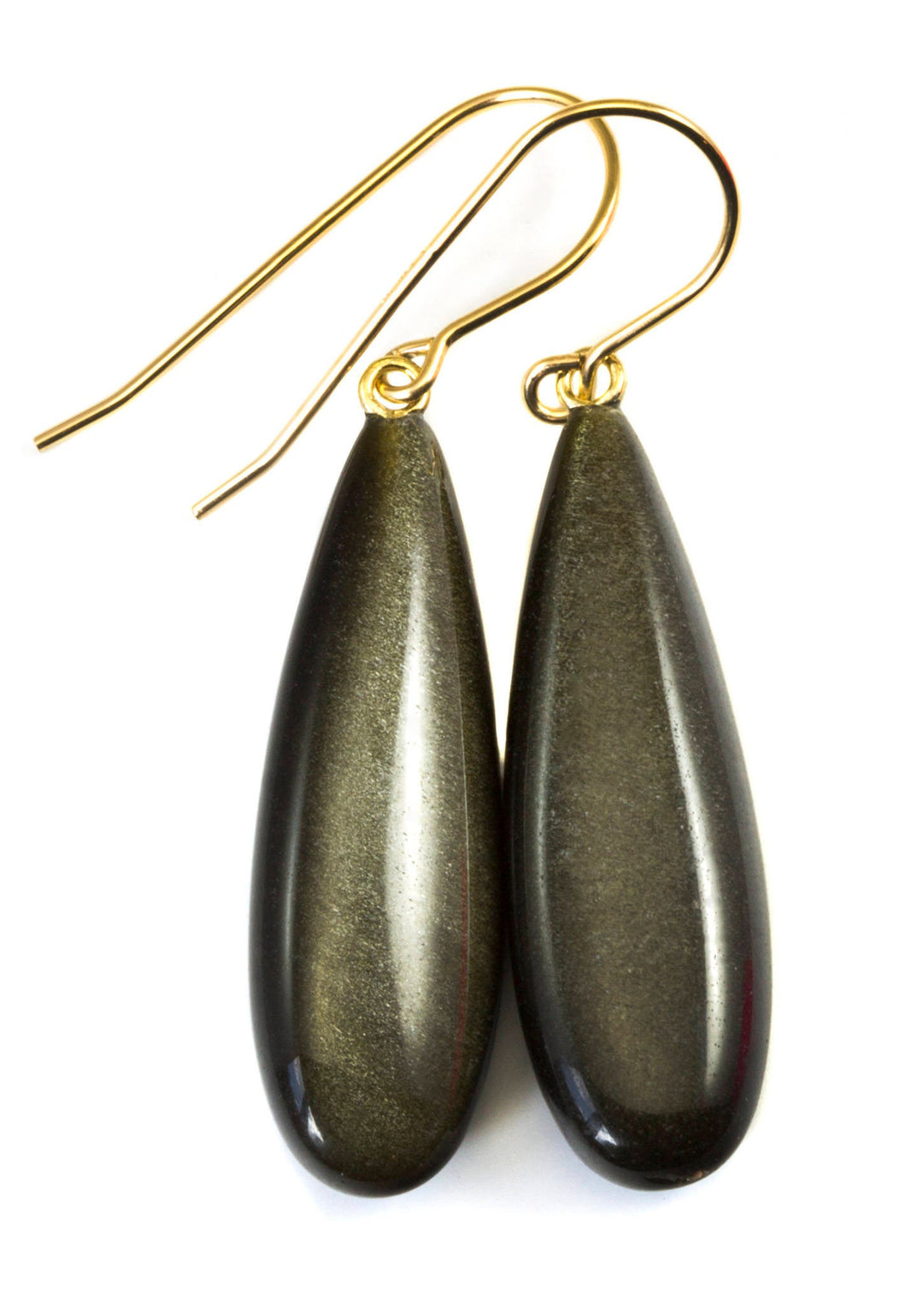 Black Obsidian Earrings Long Smooth Drop Sterling Silver or 14k Gold Filled or Solid 14k Gold Real Natural Simple Puffed Teardrops Shimmery