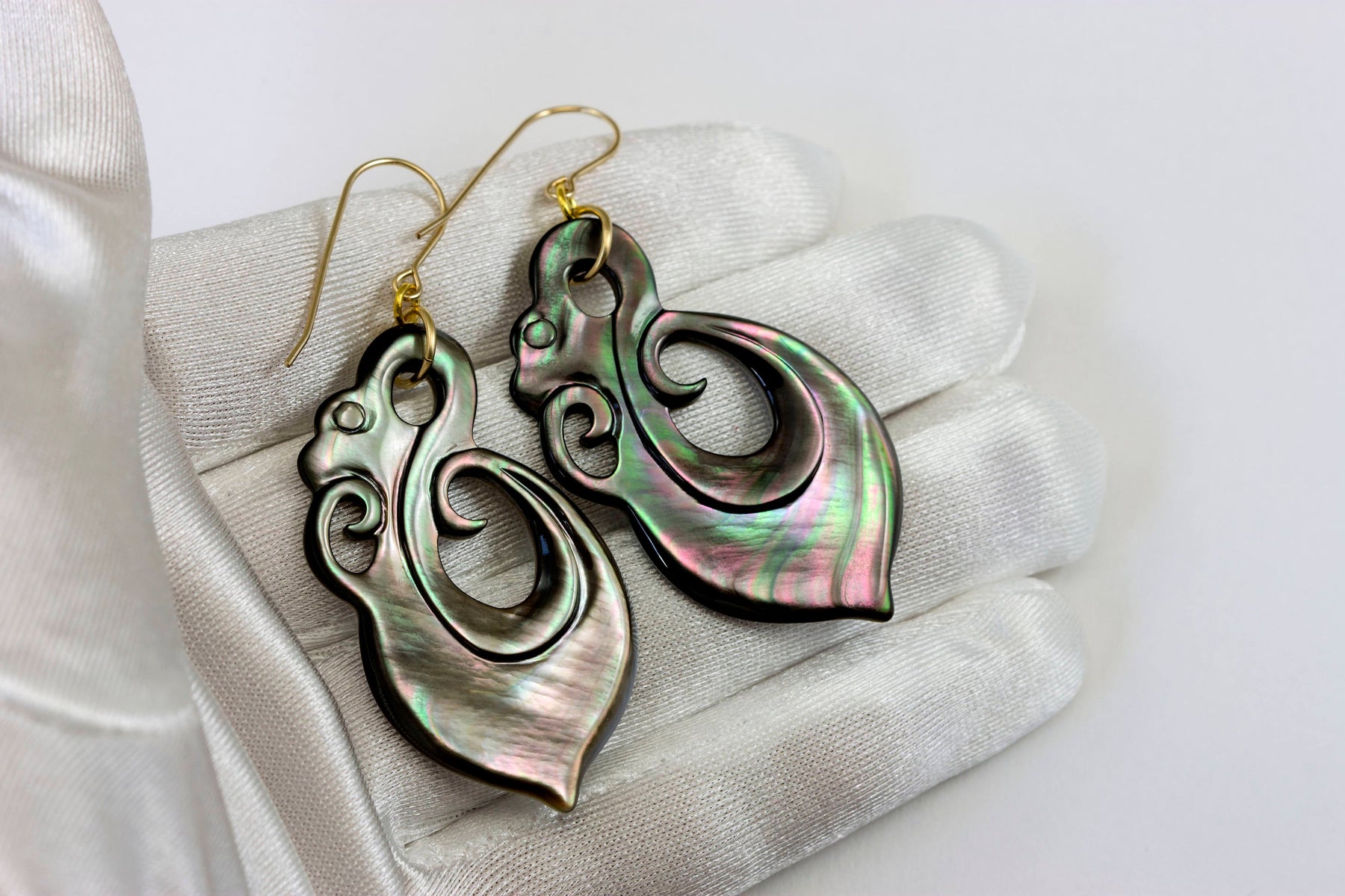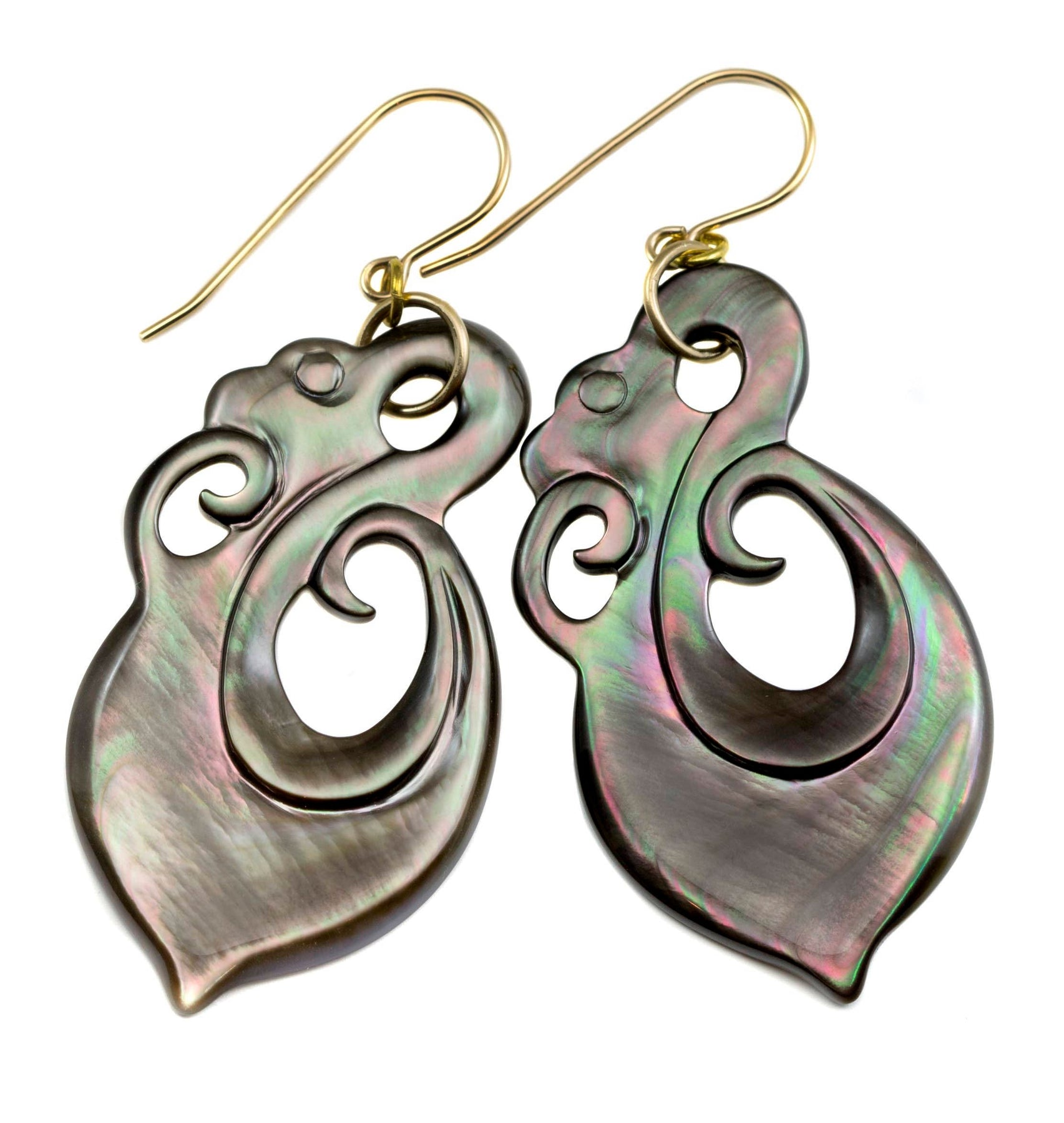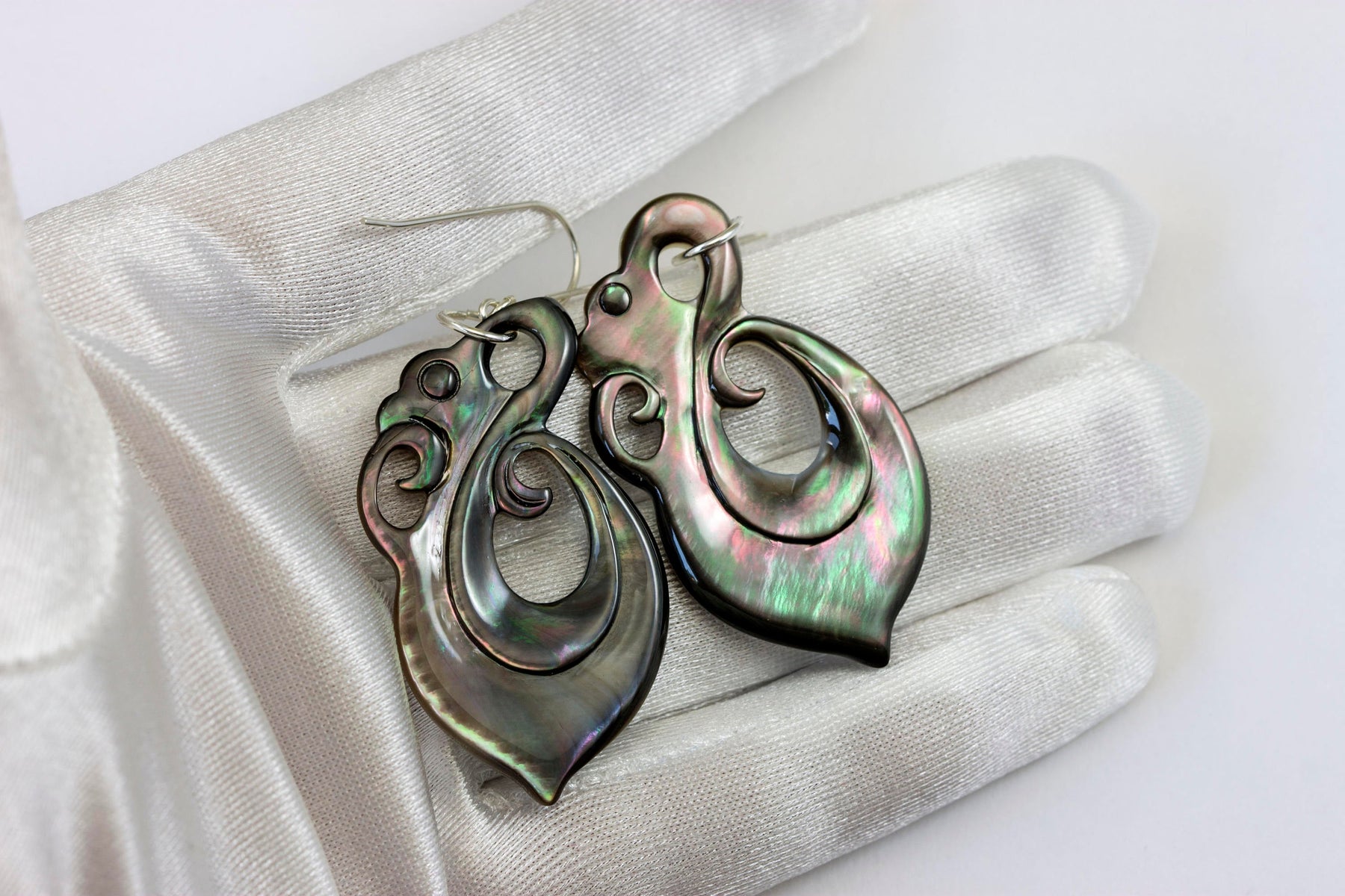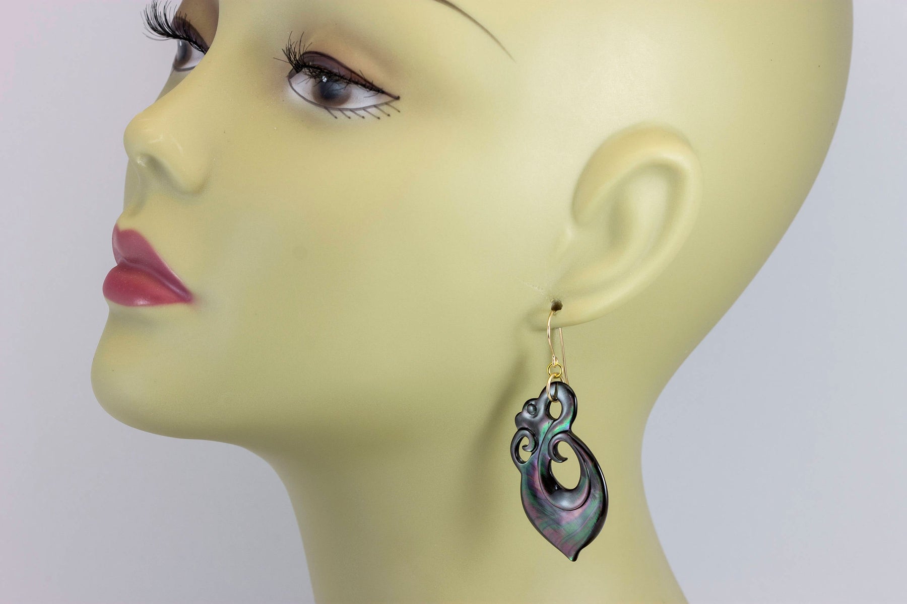 Mother of Pearl Earrings Peacock Black Shell Carved Relief Teardrop Natural 14k Solid Gold or Filled or Sterling Silver Large Luster MOP 2