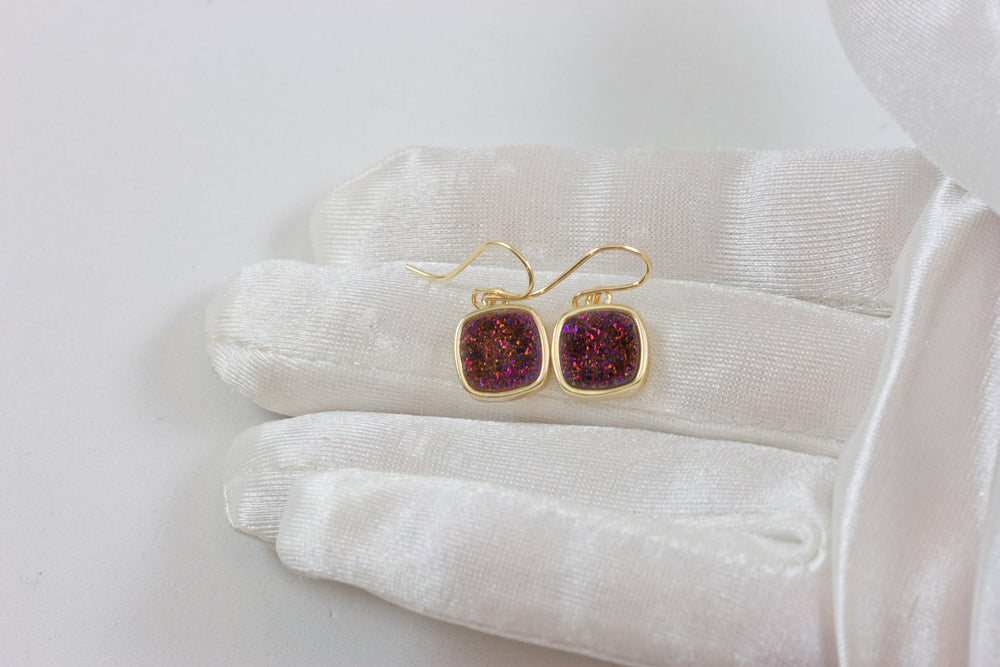 Purple Peacock Druzy Earrings Teardrop 14k Solid Gold or Filled French Ear Wires Bezel Simple Drops sparkly drusy quartz Square Cut Dainty