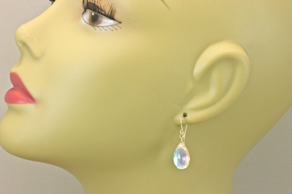 Mystic Clear Rainbow Quartz Earrings Pear Teardrop Faceted 14k Solid Gold or Filled or Sterling Silver Irisedescent colors simple drops