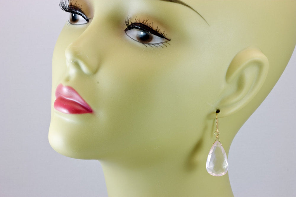 Rose Quartz Earrings Pink Large Teardrop Dangle Sterling Silver or 14k solid Gold or Filled Classic Pear Faceted Simple Everyday Soft color