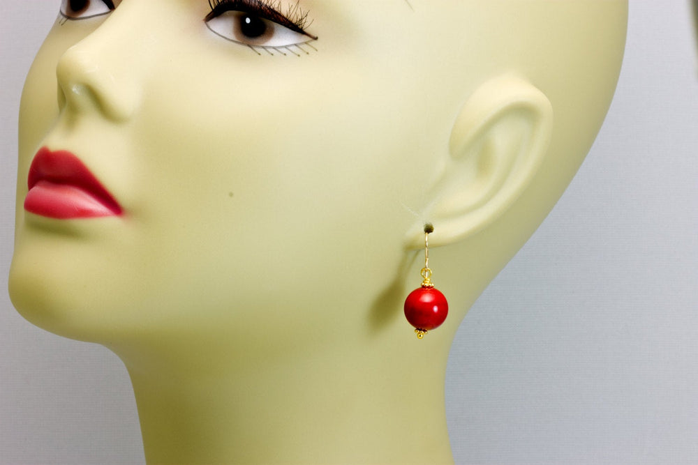 Red Coral Earrings Round Smooth Drops 14k Gold Filled or Sterling Silver Basic round drop beaded accents simple dainty daily wear design