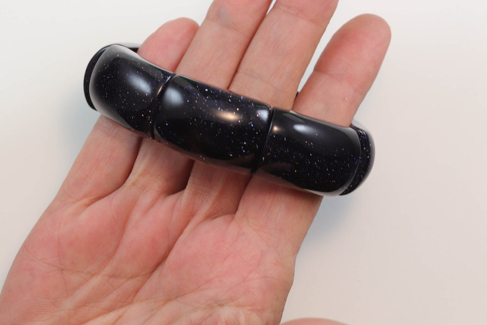 Goldstone Bracelet Large Chunky Bangle Style Stretchy Blue Rectangular shaped Stones 6.5 7 Inches Adjustable natural Polished Large
